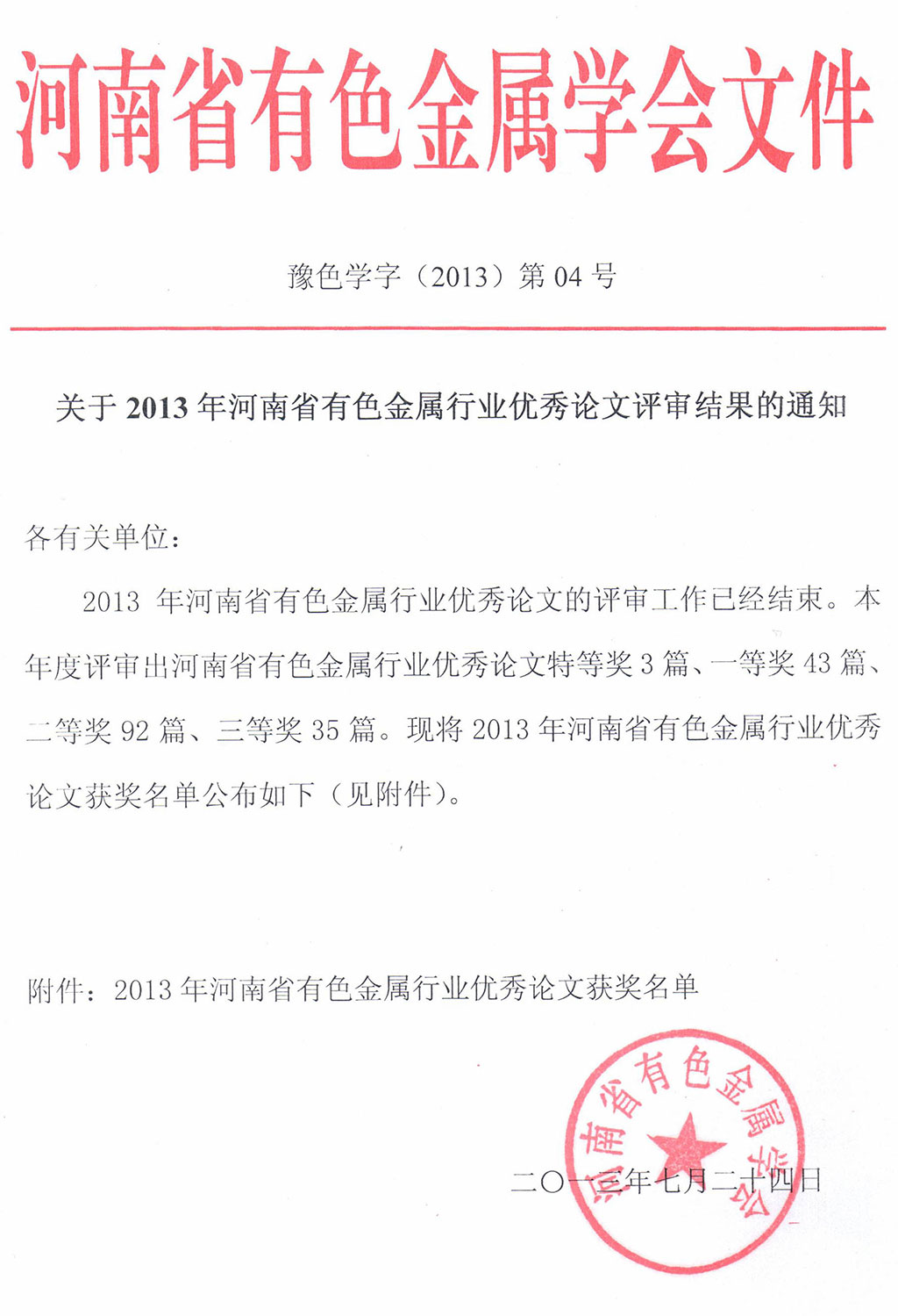 关于2013年河南省有色金属行业优秀论文评审结果的通知