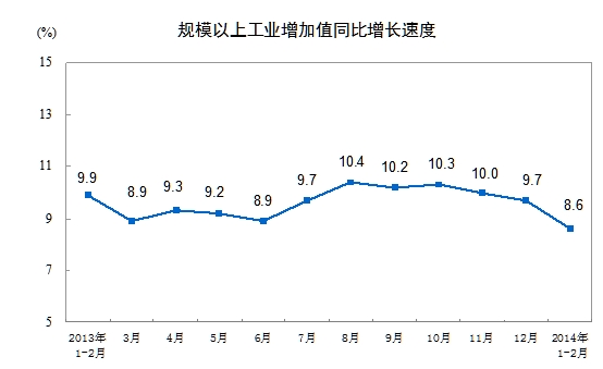 2014年1-2月份,规模以上工业增加值同比实际增长8.6 %(以下增加值增速均为扣除价格因素的实际增长率)。从环比看,2月份比上月增长0.61%。