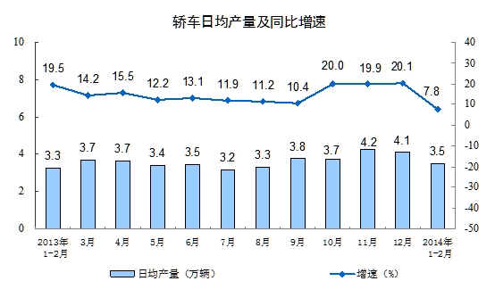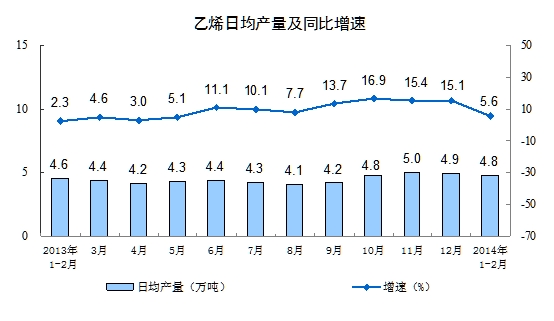 分产品看,1-2月份,多种产品同比增长。其中,乙烯281万吨,同比增长5.6%;水泥24052万吨,增长2.4%;钢材16573万吨,增长4.9%;十种有色金属656万吨,增长6.1%;汽车386.9万辆,增长12.5%;轿车206.9万辆,增长7.8%;发电量8162亿千瓦时,增长5.5%;原油加工量7878万吨,下降1.0%。