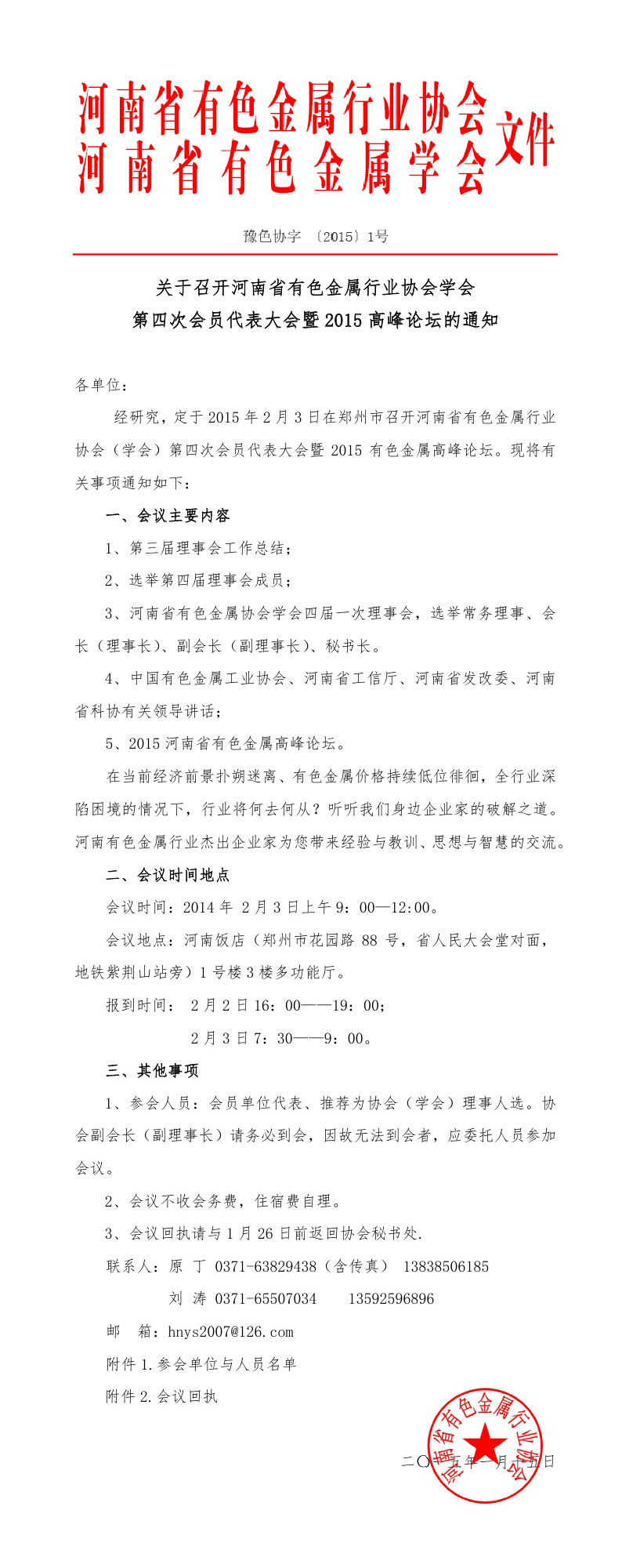 关于召开河南省有色金属行业协会学会第四次会员代表大会暨2015高峰论坛的通知.PDF