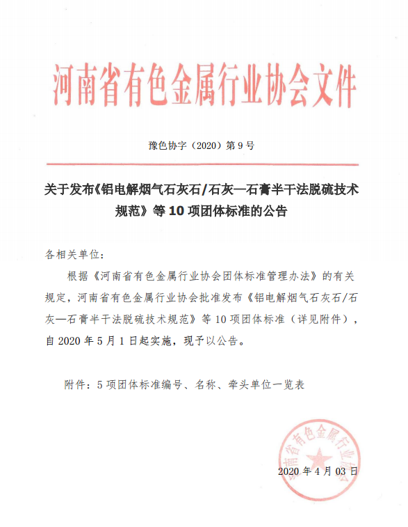 关于发布《铝电解烟气石灰石/石灰—石膏半干法脱硫技术规范》等10项团体标准的公告