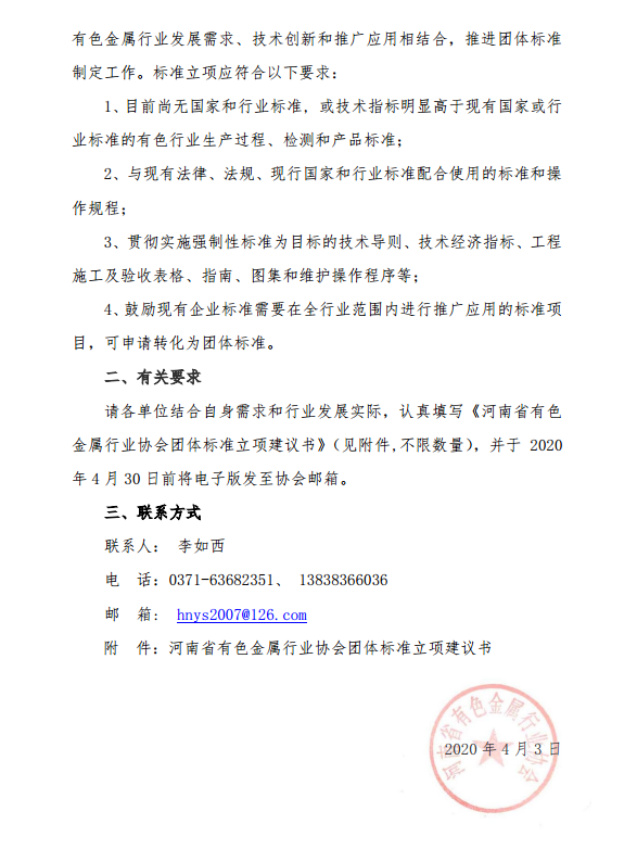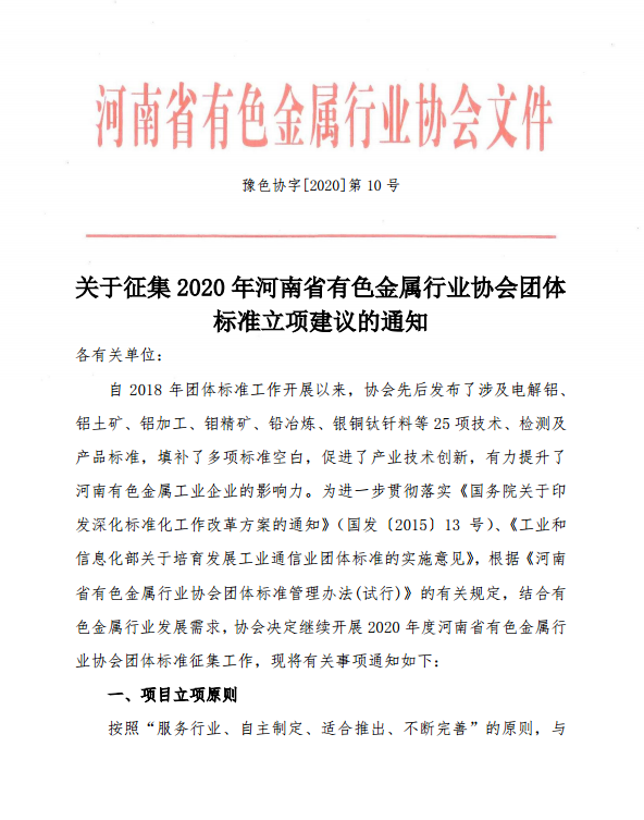 关于征集2020年河南省有色金属行业协会团体标准立项建议的通知 |