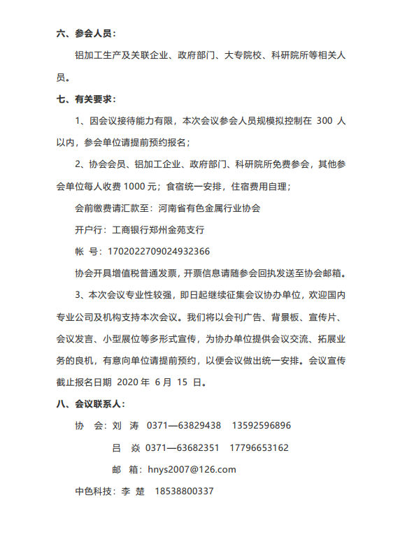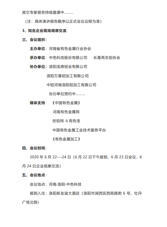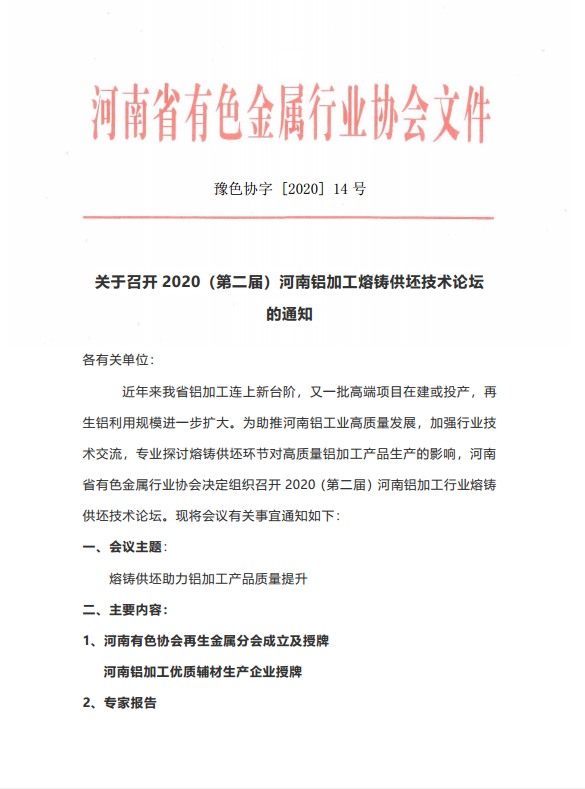 近年来我省铝加工连上新台阶,又一批高端项目在建或投产,再生铝利用规模进一步扩大。为助推河南铝工业高质量发展,加强行业技术交流,专业探讨熔铸供坯环节对高质量铝加工产品生产的影响,河南省有色金属行业协会决定组织召开2020(第二届)河南铝加工行业熔铸供坯技术论坛。