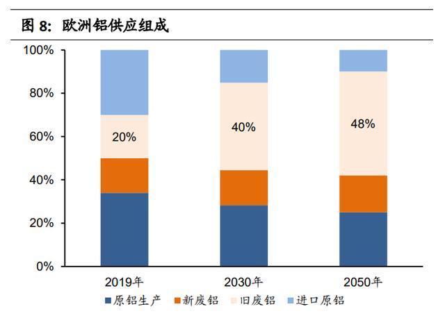 加强铝回收是全球趋势,压减铝行业碳排放是全球共识,而扩大再生铝使用是国外减少碳排放的主要路 径之一。2020 年 4 月份,欧洲铝业协会宣布启动《再生铝行动计划》,力争到 2050 年再生铝能占到铝供应量 50%,替代高碳排放强度的进口原铝,在降低 进口铝依赖度的同时,达到降低碳排放 46%的目的。