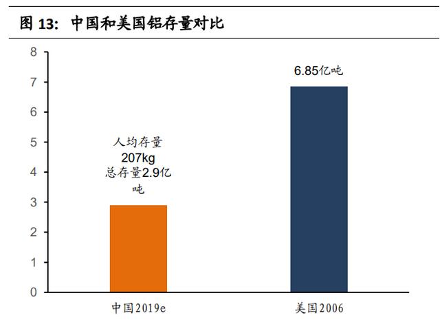 根据国际铝业协会统计数据,2019年全球共产生旧废铝1997万吨,新废铝1443 万吨。旧废铝最大的来源是包装领域,主要是废旧易拉罐,其次是交通运输领域,主要是报废汽车。这两个领域铝消耗量大,且回收率高。废铝回收量取决于国内废铝存量,相较于国外发达国家,我国工业化历程较短, 社会积蓄的铝总量还比较少。根据安泰科统计,2019年我国人均铝存量 207kg, 社会总存量 2.9 亿吨,而美国 2006 年人均铝存量就已达 489kg,社会总存量 6.85 亿吨。