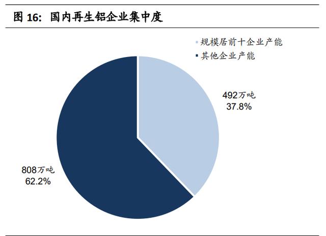 我国再生铝企业主要分布在工业发达且便于进口废旧金属的沿海地区,如环渤海、长三角、珠三角、川渝地区,以及具有产业基础和政策扶持的江西、河南 等地。根据有色金属工业协会再生分会的数据,2019年我国再生铝企业产能超过 30 万吨有8 家,产能介于 10-30 万吨的有 19 家,产能介于 5-10 万吨的有 36 家。工信部对再生铝企业规模规定为新建再生铝项目规模应在年产 10 万吨 以上,现有再生铝企业生产规模不小于年产 5 万吨。近年来有关部门对再生铝 企业生产装备、环保措施、能耗等方面的规定趋严,尤其是生态环境部将铝灰 纳入《国家危险废物名录(2021 年版)》,具备危废处理资质和设备的企业受益,而不具备危废处理资质的中小企业生产成本将抬升。