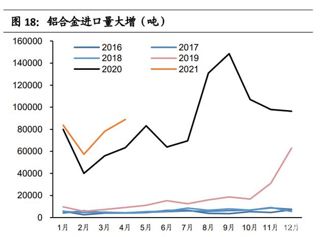 虽然我国进口废铝逐年下降,进口再生铝合金锭却明显增加。自 2019 年下半年开始,随着废铝进口实行批文制,部分国外废铝资源以再生合金 锭的形式进口到国内,即先在国外将废铝加工成再生合金锭,再以未锻轧铝合金的形式进入国内,规避批文数量的限制。尤其是 2020 年下半年以来,随着原铝进口利润走阔,再生合金锭进口利润也在增加,铝合金锭单月进口量创下 历史最大值。