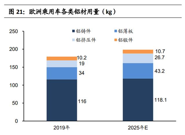 汽车用再生铝面临新挑战。近年来随着新能源汽车普及,汽车当中的铝应用形 式发生了改变。根据欧洲铝业协会对欧洲在产乘用车,包括燃油车和电动车所 用铝部件进行统计,得出各个部分的用铝量平均值,并认为随着电 动车逐渐普及,汽车发动机用铝量、变速器用铝量将逐年下降,电池包、车身 覆盖件、电动机外壳等部位用铝量将显著增加。该趋势同样适用于我国,随着 汽车电动化推进,再生铝的重要消费领域燃油车发动机缸体缸盖、变速箱需求 减少,而电动车新增用铝部件如电池包等很少使用再生铝,因此铝铸件包括再生铝在汽车用铝中的占比有可能减少。