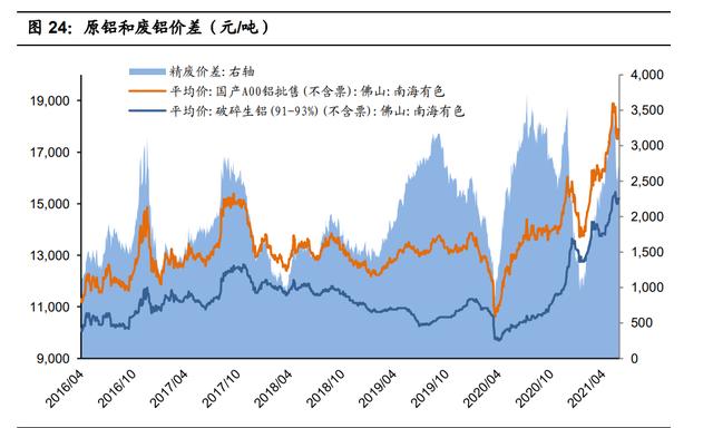 原铝和废铝具有一定的相互替代性,但替代性受经济性、产品成分要求、工艺 水平等因素制约。影响企业废铝添加比例的重要因素是原铝和废铝的价差。在 铝价上涨过程中,原铝价格涨幅大于废铝价格涨幅,精废价差扩大;在铝价下 跌过程中,原铝价格跌幅大于废铝价格跌幅,精废价差收窄。精废价差越大, 企业提高再生铝使用比例的意愿就越强,但也要考虑铝合金产品的元素含量标 准。相反,如 2020 年 3、4 月份,国内废铝回收受疫情影响大幅减少,而疫情 结束后需求迅速回暖,造成原铝和废铝价差急剧收窄,出现了原铝对废铝的反 向替代,如再生铝生产企业永茂泰在 2020 年 1-6 月废铝投量占比显著下降,主 要原因就是废铝供应量减少,精废价差收窄,公司增加了原铝投入量。