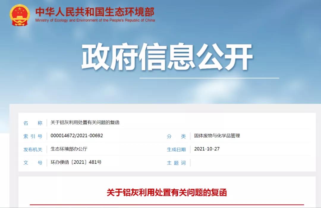 你厅《关于铝灰利用处置有关问题的请示》(粤环报〔2021〕74号)收悉。经研究,函复如下。