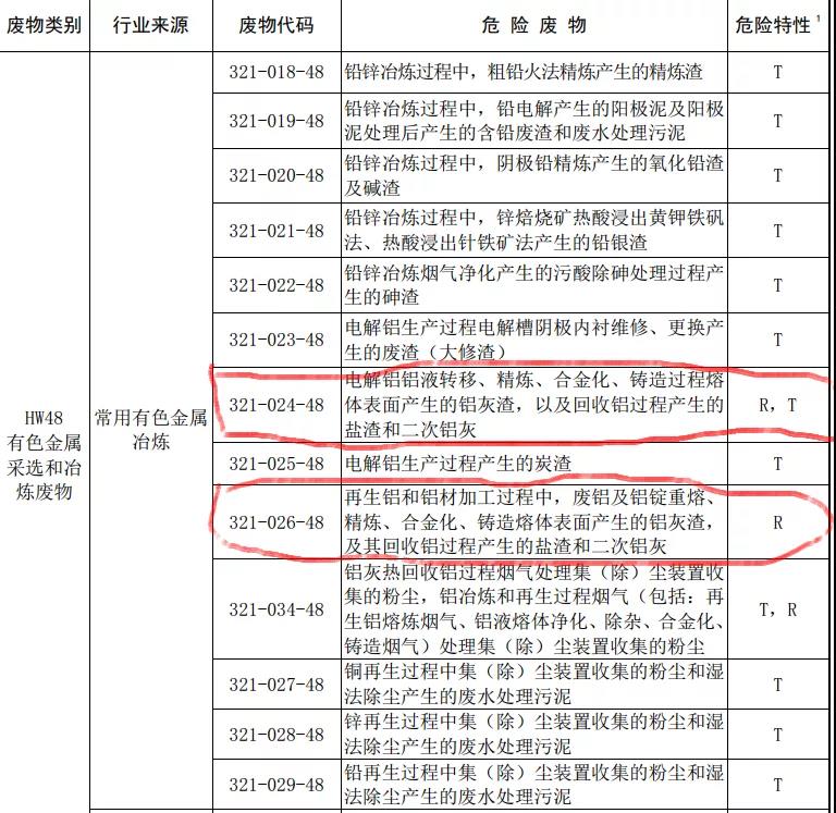 一、铝灰是铝工业生产过程产生的废渣,分为一次铝灰和二次铝灰。除铝含量差异外,两种铝灰物质组成相似,环境危害特性均为反应性,部分铝灰还具有浸出毒性或者遇水释放易燃性气体。鉴于铝灰环境风险较高,2016年版《国家危险废物名录》已将其纳入,废物代码为321-024-48和321-026-48。新修订的《国家危险废物名录(2021年版)》(以下简称《名录》)根据铝灰来源进一步明确了铝灰的危险特性和属性,废物代码仍为321-024-48和321-026-48。因此,应严格按照危险废物相关管理要求加强对铝灰的环境监管。
