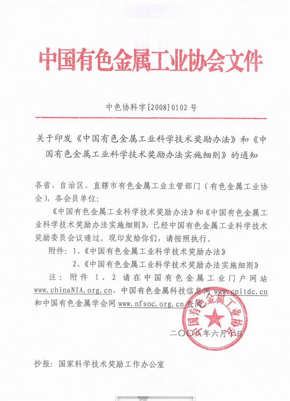 印发《中国有色金属工业科技奖励办法及实施细