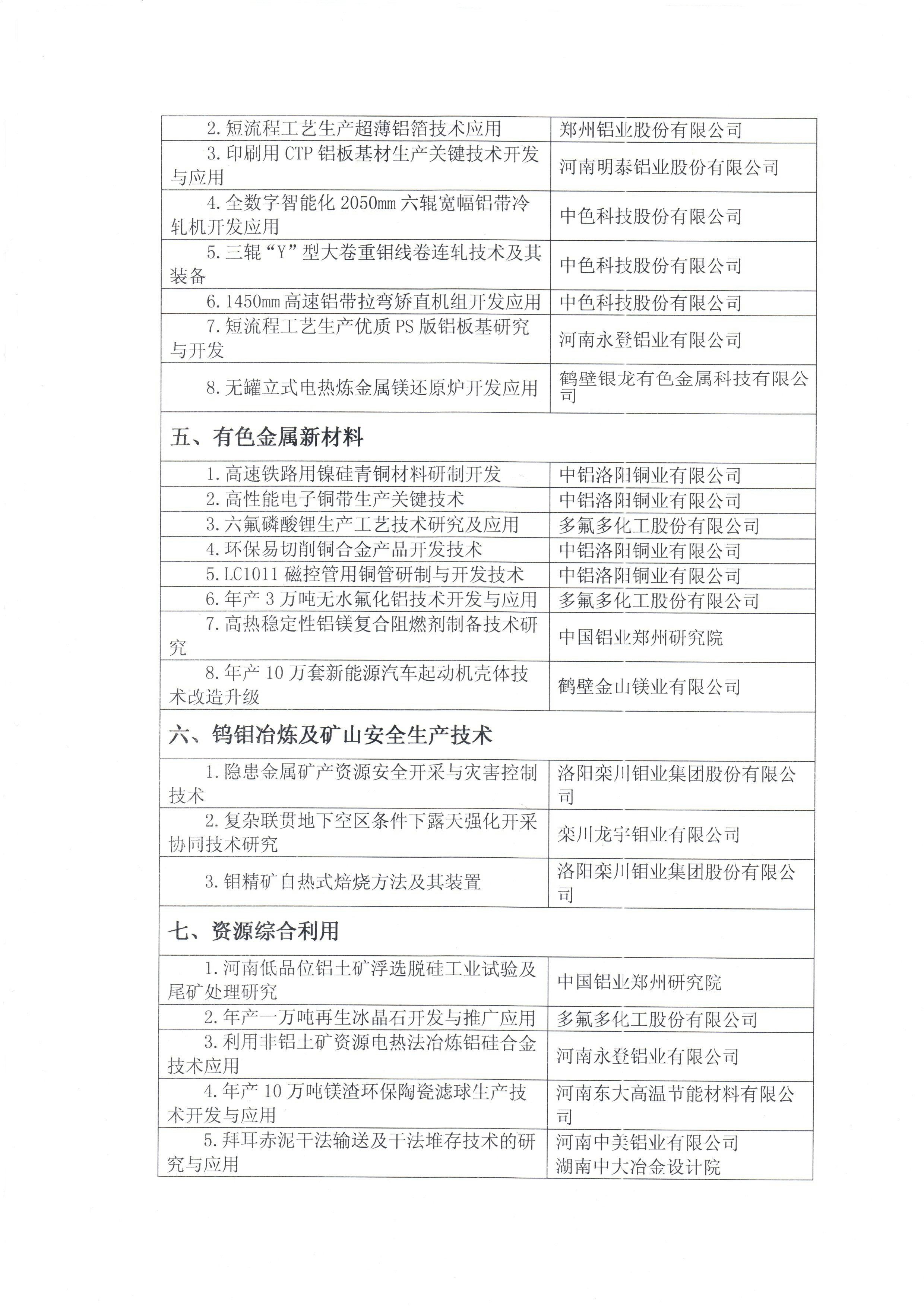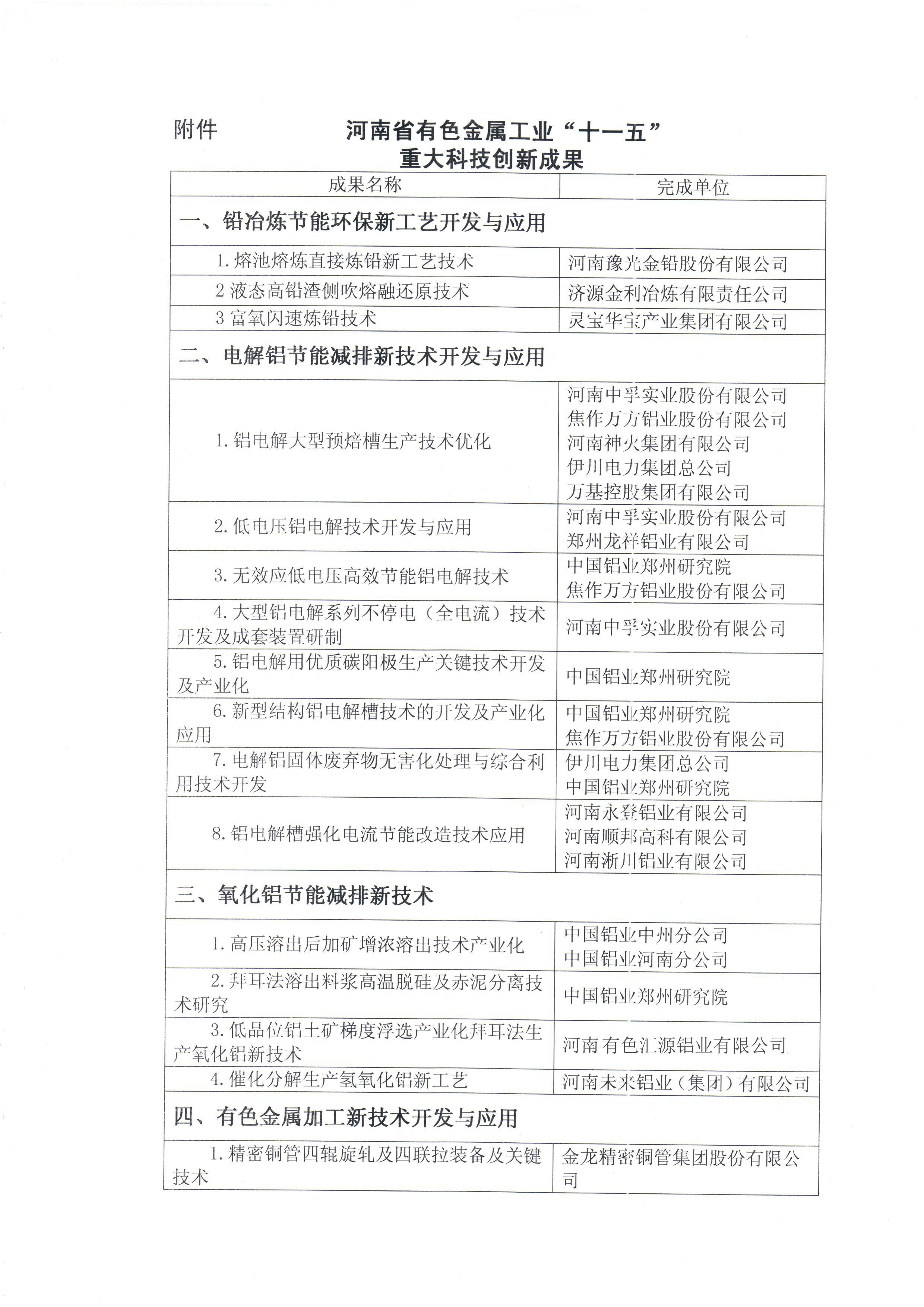 关于河南省有色金属工业“十一五”重大科技创新成果的公示