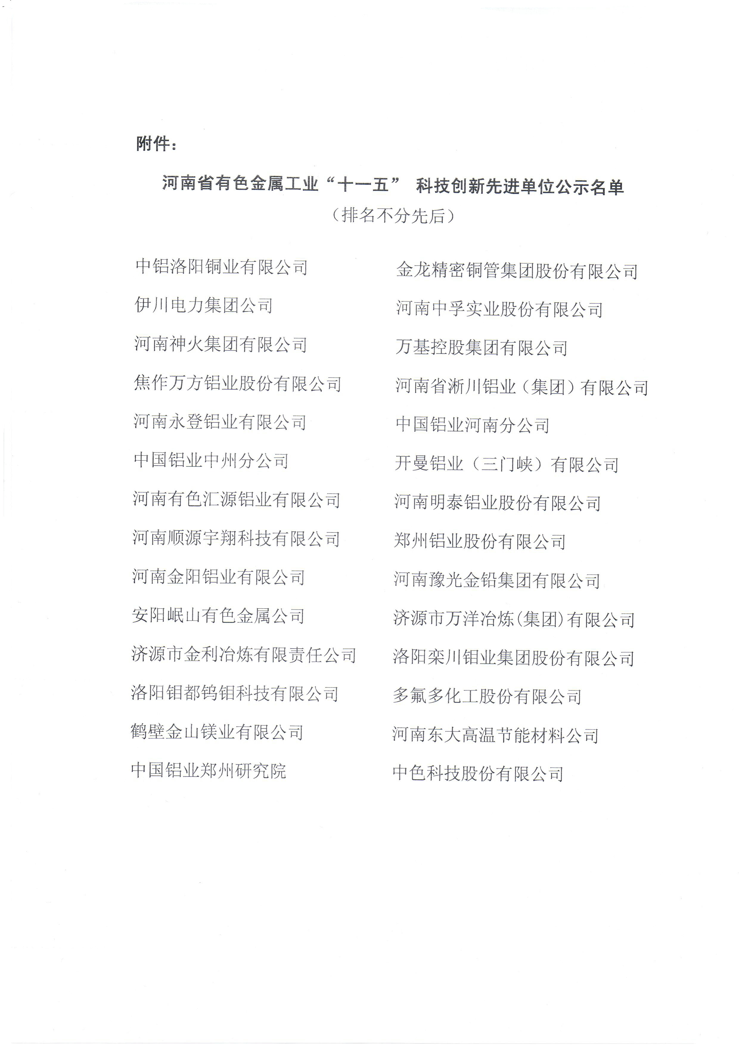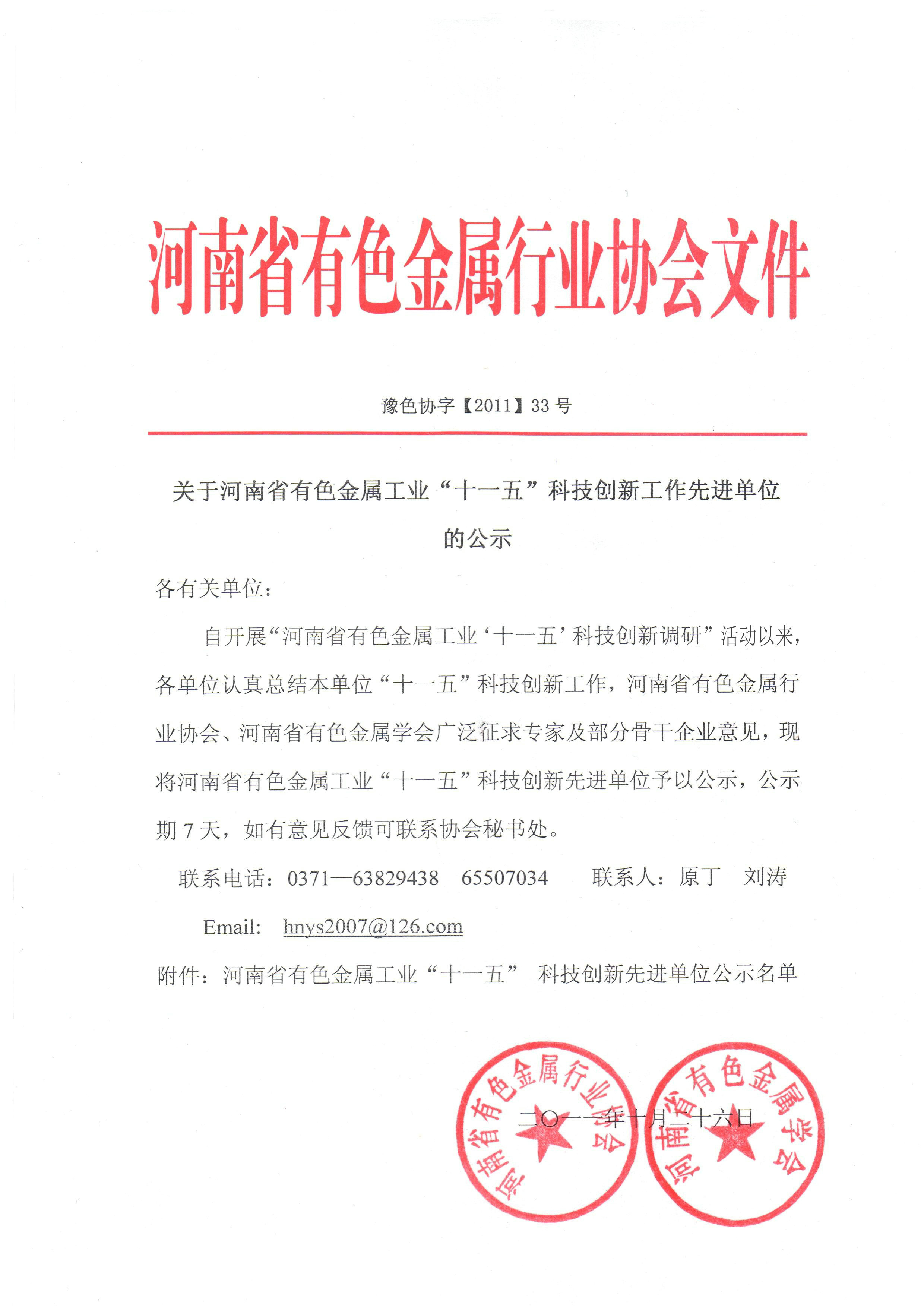 关于河南省有色金属工业“十一五”科技创新工作先进单位的公示