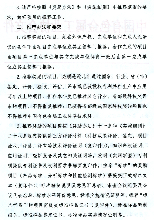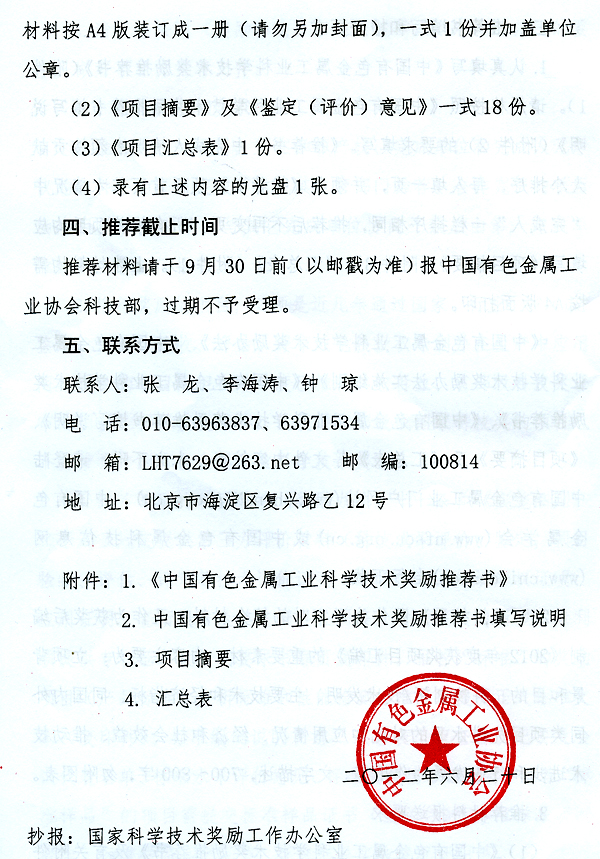 关于2012年度中国有色金属工业科学技术奖励推荐工作的通知