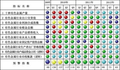 内容摘要: 中经有色金属产业预警灯号图  三季度,中经有色金属产业景气指数为97.7,较上季度下降0.2点;中经有色金属产业预警指数为63.3,较上季度下降10点。