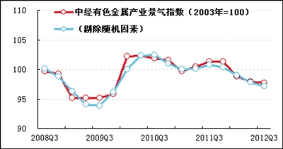 2012年三季度,中经有色金属产业①景气指数为97.7(2003年增长水平=100),较上季度下降0.2点,降幅进一步收窄,呈现缓中趋稳的走势。在构成中经有色金属产业景气指数的6个指标(仅剔除季节因素,保留随机因素②)中,有色金属行业出口交货值同比增速回升,销售收入、从业人员数增速与上季度基本持平,固定资产投资总额、税金总额、利润总额同比增速则继续放缓。进一步剔除随机因素后,三季度中经有色金属产业景气指数为97.1(见蓝色曲线),较上季度下降0.7点,降幅较未剔除随机因素的景气指数(见红色曲线)有所扩大。