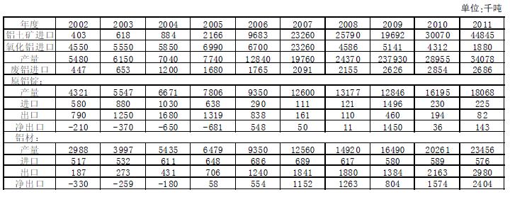 原铝产量从2002年4321kt上升到2011年的18068kt,复化增长率17.2%;今年1~7月的产量11284.711kt,全年的产量可能达到19690kt,同比增加9.0%。氧化铝与原铝的这种高速持续发展,在世界铝工业发展史上是绝无仅有的。从表中所列数据可见,从2006年起中国成原铝锭净出口国,可惜净进口量呈下降趋势。这10年铝的总产量106630kt,为建国以来前53年总量的2.68倍。