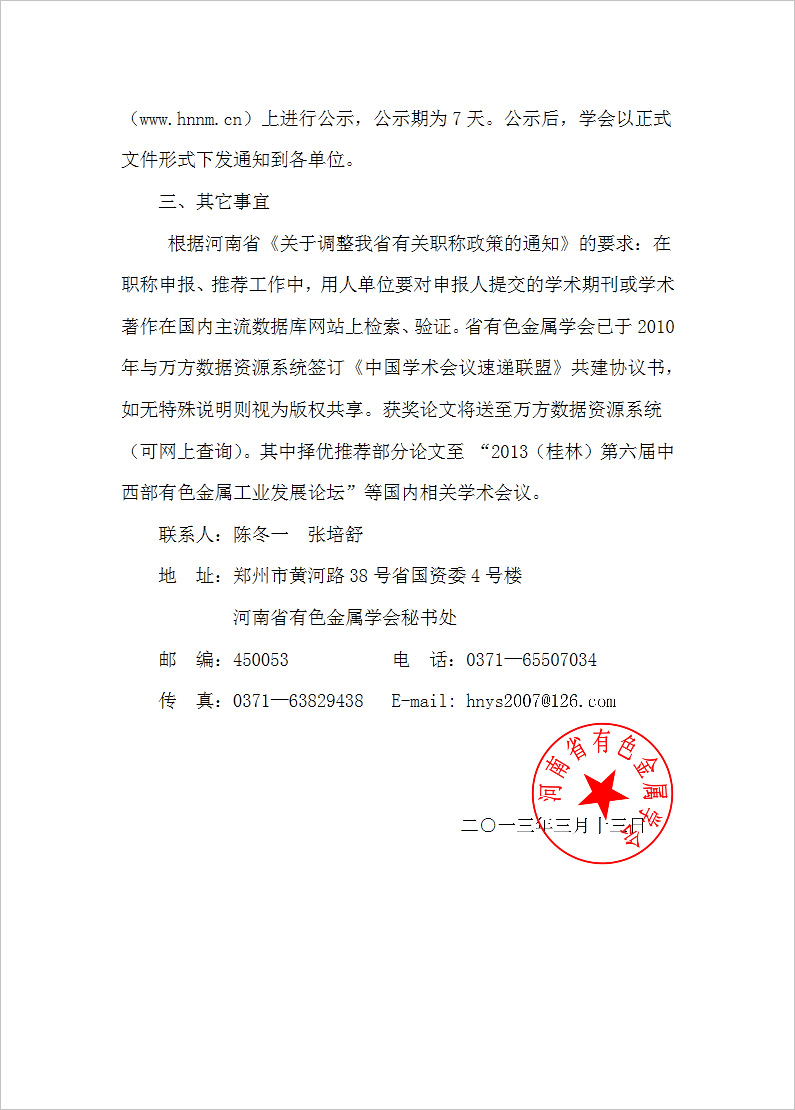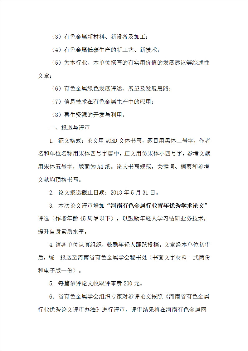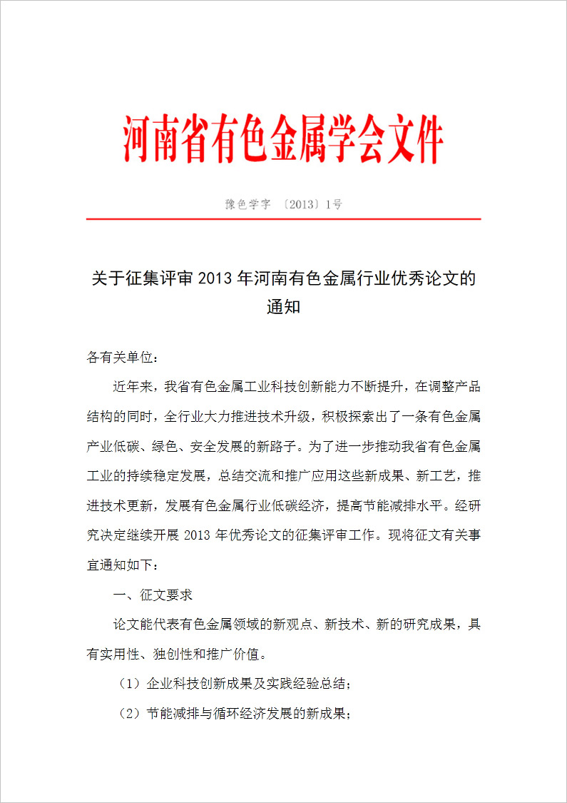关于征集评审2013年河南有色金属行业优秀论文的通知